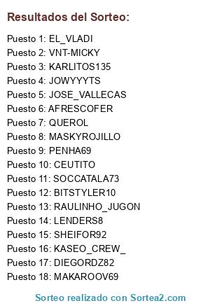 Lista de participantes: CEUTITO, KARLITOS135, DIEGORDZ82, JOWYYYTS, RAULINHO_JUGON, SOCCATALA73, VNT-MICKY, QUEROL, PENHA69, AFRESCOFER, BITSTYLER10, JOSE_VALLECAS, KASEO_CREW_, LENDERS8, SHEIFOR92, EL_VLADI, MASKYROJILLO, MAKAROOV69.