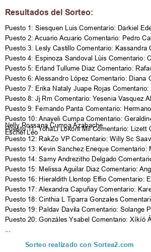 - Ganador 1: Siesquen Luis Comentario: Darkiel Eder Rober Salazar Mas Perly Marily Aponte Cumpa ata vamos 🍻🍻🍻