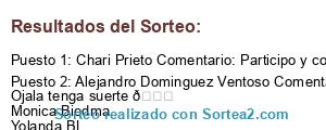 - Ganador: Chari Prieto Comentario: Participo y comparto con Chari Carmona Prieto, Francisco Manuel Mejias Palacios, Manuel Carmona Prieto.Suerte