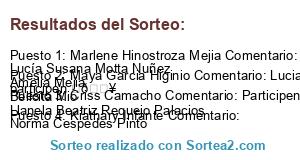 - Ganador 1: Marlene Hinostroza Mejia Comentario: Los sigo en IG como marlenehinostroza parrixpen chicas Fari Eli Lucía Susana Motta Nuñez Amelia Mejia Bellcita Mio Llanela Beatriz Requejo Palacios Norma Cespedes Pinto