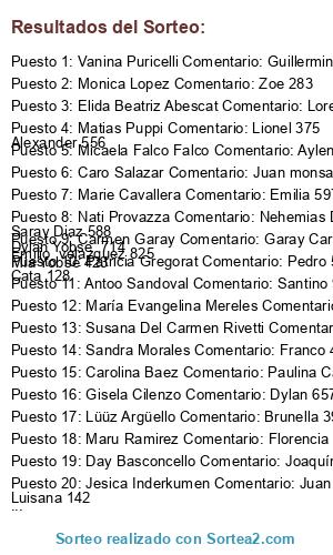 - Ganador 20: Jesica Inderkumen Comentario: Juan Cruz 752 Luisana 142