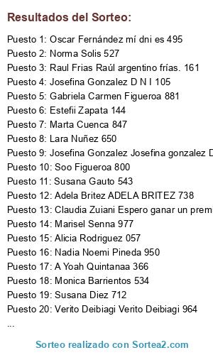 Lista de participantes: Yaneet Saucedo 313 , Maria Angeles Coronel 346 , Agostina Caamaño 631 , DieeGuitoo DaaViidd Diego gomez 576 , Estela Blanco 294 , La Bucanera Sole Ortiz 224 , La Bucanera Sole Ortiz 828 , Daniel Valenzuela 177 , Daniel Morales Muy bueno 832 , Elchi del Campo Elsa 155 , Alicia Rodriguez 057 , Claudia Lopez 872 , Silvia Gladys Fernandez 055 , Betty Brite 443 , Laura Mariel Sanchez 942 , Miriam Mendoza 790 , Alberto Balduga 46ios les bendiga , Ely Rey 235 , Ruben Angel Molina Ruben Angel Molina 744 , Monica Graciela Sanchez SANCHEZ Mónica 357 , Griselda Aguirre 711 , Cristina Del Carmen Varela CRISTINA VARELA 520 , Soraya Patricia Vasallo 905..bendiciones , Yani Carrara 298 , María Mercedes Mendoza 518 , Daiana Oviedo 879 , Gladyz Garcia 737 , Pedro Cabral @ [100018116256240:] Cabral 542 , Belén Soto Arias 065 , Cris Ortigoza 314 , Mirtha Duarte 260 , Hilda Aide Fleyta 572 , Lauriita Leyes 217 , Elba Rodriguez 538 , Andrea Obregon 972 , Mirta Barrios 358 , Omar Almiron 655 , Chela Piris 162 , Carolina Giselle Sarasua Carolina Giselle Sarasua 614 , Agustina Gomez 104 , Ermelinda Quiroz 150 , Estefii Zapata 144 , Norma Solis 527 , Carmen Bravo cuando sortea , Margarita Linares 085 , Alex Morales 645 Alex Morales , Gladys Acevedo 779 , Graciela Salvatierra Dni 121 , Susana Diez 712 , Fani Barrios Barrios Marisa 196 , Silvia Villalba 968 , Mercedes Aquino 561 , Norma Silva 601 , Mariana Galarza 613 , Camila Rodriguez 769 , Danielitaa Solcitoo Goy 365 , Maria Luisa Insaurrald 726 , Agostina Doubik 149 , Elsa Elizabeth Godoy 116 , Carlos Alberto Maidana 476 , Marcia Stefania 490 , Brenda Vargas 753 , Claudia Alderete 642 , Gabriela Duarte Hola kiero ganar 559 , Marcela Veronica Jara 055 , Cynthia Perez 973 , Samara AB 275 , Jorge Diaz Luis Dia 477 , Fatima Castillo Valenzuela 246 , Nancy Moreyra 136 , Fer Ibarrola Yo quiero un premio🙋🙋 Fernanda 995 , Eliana Marisel Gauna 431 , Beatriz Godoy 148 , Reina Palacios 644 , Antonella Salinas 292 :D , Carlos Martín Urbina 596 , Celia Britez 646 , Marce Montenegro 166 , Cecy Berenice de Sanchez 986 Puente Cecilia Alejandro Sanchez , Hugo Cesar Romero 380 , Griselda Gimenez 663 , Evita Ferraz 205 , Graciela Medina 076 , Ka Ri Ni Ta 264 , Veronica Alvarenga 940 , Gloria Beatríz González 253 , Claudia Fernandez 750 , Malvi Ojeda 672👍😃 , Ladiz Prinzesh 896 , Maria Cristina Radlovasky 896 , Lucia Molina 807 , Karina Elisabet Antoniolli 227 , Monica Serrano 741 , Rosa Mirtha Martinez 194 , Graciela Gauto 462 , Carmen Sandoval Me gusta 956 , Nanci Lopez Nanci 127 , Mirtha Sanchez 616 , Josefina Gonzalez Josefina gonzalez D N I 105 , Micaela Mendoza Ojalá gane je por que nunca ganó nada. 892 , Karina Torres 390 , Karina Torres Carolina Mosqueda , Romina Bernal 079 , Martina Viera 097 , Pedro Enriquez 535 , Rocío Aguirre Cerullo 198 , Gabriela Alegré 625 , Lilian Fleitas 793 , Norma Kañesky 003 , Natalia Celii Alfonso 846 , Ana Rosa Veloso Me encanta!!! Anny 064 , Ruth Sanchez 546 , Wendy Magalí A. Sardi 066 , Mariana Soledad Meza Yovanovich 722 , Gabriel Fernandez 849 , Yaque Mancuello 495 , Lilian Pezzelato Lilian 961 , Tamara Vaena DNI 491 , Brenda Blanco 062 , Cris Gauna Cristina gauna 270 , Rebeca Vera 178 , Dario Clary Alfonso Dario 203 , Iris Alonso 084 , Gladis Barrios Gladis 848 , Clara Gómez 956 , Carolina Díaz 795 , Laura Andrea Gomez 811 , Monica Rojas 995 , Nissan Teso Vera Gomeez 921 , Alicia Sosa 810 , Monica Barrientos 534 , Obregon Elii 679 , Vicky Grioni 308 , Kary Lopez Muy lindo todo lo q vnden 😗😗124 , Amanda Elena Acosta 523 , Melisa Ramirez 415 , Camy Velazquez 674 , Dolores Alegre 088 , Elizabeth Martinez 886 , Gisela N Romero 917 , Monica Marconi 500 , Romina Angione 032 , Susana Arguello 422 🙋😘😘 , Rocio Belen Ocampo 999 , Norma Vallejos 252 , Magui Pedrozo 460 , Gerardo Alejandro Alarcon 718 está muy lindo espero sacar , Nany Gomez iLDA gOMEZ 079 , Soo Figueroa 800 , Carla Villalba Diaz 045 , Mercedes Alegré 843 , Analia Itati Sena 272 espero ganar a ver si tengo suerte , Ximena Recchia 893 , Alicia Quiroz 777 , Miguel Gonzalez 068 , Rosana Gonzalez 732 , Josefina Gonzalez D N I 105 , Kike Rojas 639 , Mabel Medina 495 , Mily Heisser 669 , Valeria Ibarra espero ganar 787 , Nelida Ojeda 312 , Harold Sosa muy bueno 580 , Mariela Andrea 382 , Tito Dominguez 749 , Norma Sandoval 885 , Rosaura Rios Rosaura 163 , Mabel Aquino 775 , Juana Garcia 669 , Rosa Goralewski 950 , Julio Pedro Pomares Julio 410 , Myriam Susana Lopez Soria 908 , Carmen Sandoval Me gusta sanfoval Carmen 956 , Lilian Pezzelato Quiero ganar dni 961 , Lucia Soto soto lucia 650 , Grisel Rivero 604 , Mabel Zardi 530 , Norma Fernandez Me encanta 075 , Antonia Valdez 865 , Edith Correa 506 , Sandra Franco 170 , Clara Meza Clara Meza 264 , Arq Dario Santillán 471 , Norma Susana Gonzalez 129 , Lorena Ojeda 377 , Gabriela Carmen Figueroa 881 , Verito Deibiagi Verito Deibiagi 964 , Nelida Almiron 345 , Raul Frias Raúl argentino frías. 161 , Paola Aquino muy lindo lo que venden 055 , Griselda Gonzalez 330 , Estelita Insa 475 , Fabiiana Andrea Candiia 493 , Agostina Blanco 605 , Miguel Codas 449 , Malvina Hofsetz buenísimo 968 , Elsa Maria Feressin 076 , Roxi Ojeda Roxy 912 , Elena Elízabeth Astudillo ELY 220 , Gomez Aly del Carmen 267 , Sil Maidana 463 , Clariitaa Mediina 123 , Claudia Fernandez Claudia Fernández 750 , Marta Cuenca 847 , Ana Evangelina Perez Pisarello Q bueno me alegro ojala tenga suerte 515 , Verónica Bejarano 849 , Norma Beatriz Soria 385 , Angelina Pelozo Buenisimo yo lo compro 750 marta , Dora Barreto 109 , Romina Mitoire 224 , Noé Barrientos 805 , Noelia Soto 029 , Norma Emilce 616 , Maria Natalia Gomez 700 , Carla Gonzalez Corcia 399 , Maria Aguirre Dñi. 14562337 , Cynthia Alegre 787☺ , Angela Veron 115 , Nadia Gimenez 426 , Mercedes Gonzalez 739 , Mari Sahagun 532 , Passamani Omar Alberto 834 , Ester Aranda 635 , Mariana Segovia Me gusta 810 , Margarita Gauna 277 , Elba Acosta 447 , Ma