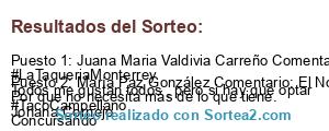 - Ganador 1: Juana Maria Valdivia Carreño Comentario: Hola #LaTaqueriaMonterrey Todos me gustan todos , pero si hay que optar #TacoCampellano Concursando