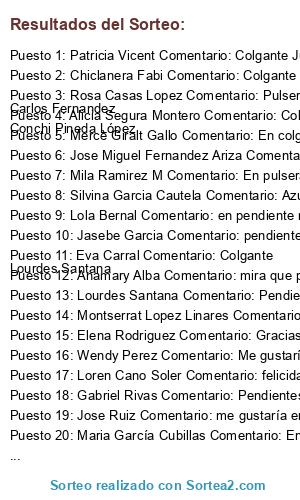 - Suplente 31: M Lorena Carrasco Comentario: Pulsera me encantaría mil gracias por el sorteo invito a Esther Pelayo