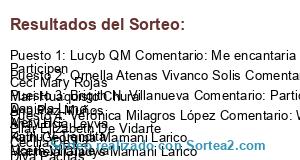 - Ganador: Lucyb QM Comentario: Me encantaria ganar para mi nena ..suerte ven Participen Ceci Mary Rojas Mari Huaquisto Chura Ana Paz Muños Ana Lucia Leyva Ruth Georgina Mamani Larico Marinela Gladys Mamani Larico Damaris Mamani Larico Yecinia Mamani Ruth Caychihua Díaz Genoveva Mamani