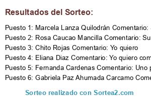 - Ganador 6: Gabriela Paz Ahumada Carcamo Comentario: Excelente sorteo! Lo quiero 😃🙏🏼