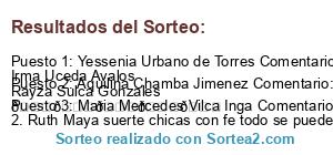 - Ganador 3: Maria Mercedes Vilca Inga Comentario: Este regalo sería para mi hija hermosa espero que participen chicas 😍😍😍♥️ 1.Liz Deivis Oquendo Espinoza 2. Ruth Maya suerte chicas con fe todo se puede, 👍👍👋