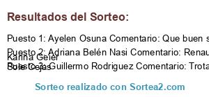 - Ganador: Ayelen Osuna Comentario: Que buen sorteo! Se lo daria a mi papa Mario Luis Osuna Karina Geier Sole Cejas