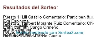 - Ganador 1: Lili Castillo Comentario: Participen 🍀🙆 Eva Espinoza Deyci Castillo Judith Jhoanna Lorena Estrada Trujillo Nilton Mendieta Cazorla