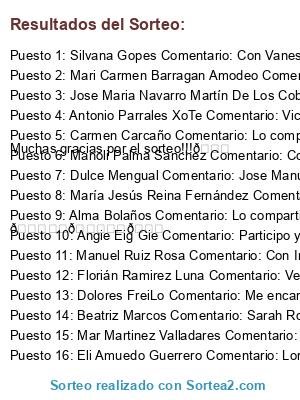 - Suplente 4: Carmen Carcaño Comentario: Lo compartiría con Manuel HM Muchas gracias por el sorteo!!!😊