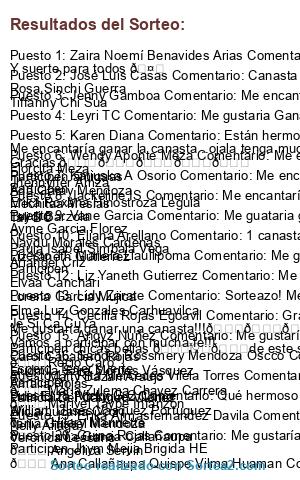- Ganador 14: Cecilia Rojas Egoavil Comentario: Gracias por este lindo sorteo 🍀🍀🍀🍀🍀 Me gustaría ganar una canasta!!!🙋🙋🙋🙋🙋🙋🙋🙋🙋🙋🙋🌺🌺🌺🌺🌺🌺🌺🌺🌺 Vamos a participar con mucha fe!!! Carol Caballero Rojas Liudmila Sara Montes Vásquez Amalia Rojas Patricia Del Carmen Vilchez Alicia Lucana Ccori Nelly Aliaga
