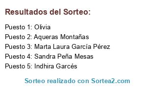 Lista de participantes: Patricia, disqus_KwfGHs8O46, Ana Ganga N, Indhira Garcés, Iván Ariza Martínez, Aqueras Montañas, Marta Laura García Pérez, ivanp, MIkel Menchero Pérez, Olivia, Sandra Peña Mesas, Paula García Salanova, Roser Goula, MMar Enríquez, todomundopeques, Chus San Salavdor, Laia Casadevall Coll, Sandra Gama, Ainhoa, Ana jurado, rocio.