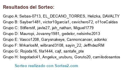 Lista de participantes: Garysnakeye, Stiflerstif, Angelux_uruburu, victor10garcia1, JeffhdezRM, nelsinho2013, gedelor, Mauropi, Sebas-0713, wilbrand3108, Cannoncancer, Rojoda16, camilodosantos, cajf, Vasco1208, o11ceCaldas, santafe_pte, javle27, cevichero72, bogotadc41, Jovanny1981, Sayber1481, fila1444, Goruto20, EL_DECANO_TORRES, Miguel1779, MrkarlosM, Helizka, adonko, jah_nathan, sayin_22, DAVALTY.
