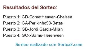 Lista de participantes: GA-Perikinho90-Betas, GB-Jordi Garcia-Milan, GC-xSamu-Herenveen, GD-CometHeaven-Chelsea.