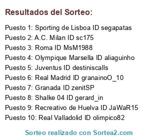 Lista de participantes: Juventus ID destiniscalls, Real Madrid ID granainoO_10, Granada ID zenitSP, Olympique Marsella ID aliaguinho, Sporting de Lisboa ID segapatas, Real Valladolid ID olimpico82, Shalke 04 ID gerard_in, A.C. Milan ID sc175, Recreativo de Huelva ID JaWaR15, Roma ID MsM1988.