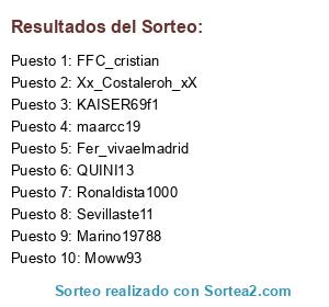 Lista de participantes: Fer_vivaelmadrid, Marino19788, maarcc19, FFC_cristian, Ronaldista1000, QUINI13, KAISER69f1, Sevillaste11, Xx_Costaleroh_xX, Moww93.