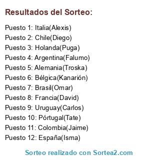 Lista de participantes: Bélgica(Kanarión), España(Isma), Brasil(Omar), Italia(Alexis), Chile(Diego), Alemania(Troska), Pórtugal(Tate), Argentina(Falumo), Holanda(Puga), Uruguay(Carlos), Francia(David), Colombia(Jaime).