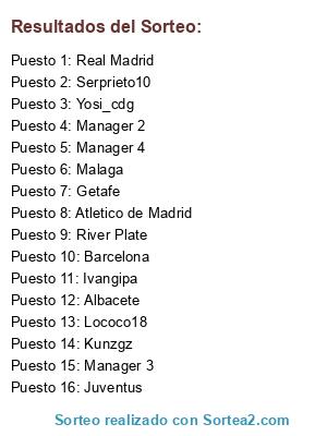 Lista de participantes: Atletico de Madrid, Albacete, Real Madrid, River Plate, Juventus, Barcelona, Malaga, Getafe, Yosi_cdg, Ivangipa, Serprieto10, Lococo18, Kunzgz, Manager 2, Manager 3, Manager 4.