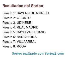 Lista de participantes: BARCELONA, BAYERN DE MUNICH, RAYO VALLECANO, VILLARREAL, OPORTO, UDINESE, REAL MADRID, RODA.