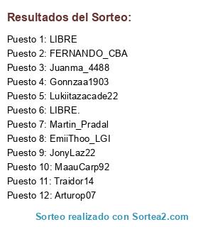 Lista de participantes: Juanma_4488, Lukiitazacade22, Gonnzaa1903, Nikoparra6, LIBRE, Arturop07, MaauCarp92, Martin_Pradal, FERNANDO_CBA, EmiiThoo_LGI, JonyLaz22, LIBRE..