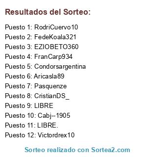 Lista de participantes: Condorsargentina, FranCarp934, CristianDS_, Aricasla89, RodriCuervo10, Victordrex10, FedeKoala321, LIBRE, Cabj--1905, EZIOBETO360, Pasquenze, LIBRE..