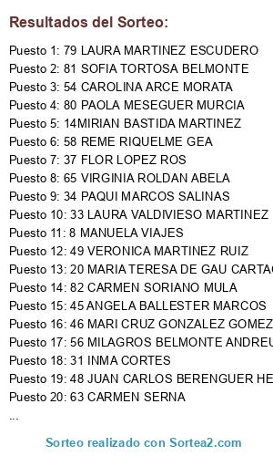 Lista de participantes: 1 MARIA MULA, 2 RAQUEL GUIRADO TRUJILLO, 3 TRINIDAD CABRERA, 4 NEFTALI REQUENA SUAREZ, 5 SUSANA SALAZAR ROJO, 6 MARIA FERRER, 7 EVA GRAU ESCOLANO, 8 MANUELA VIAJES, 9 ELENA SAMPER GAMBIN, 10 IRENE DEL CERRO ROS, 11 NOELIA RUIZ HERNANDEZ, 12 ANGELES ILLAN AMOROS, 13 ANABEL AMOROS ILLAN, 14MIRIAN BASTIDA MARTINEZ, 15 MANOLITA HERNANDEZ SORIANO, 16 ISABEL CARRILLO RIERA, 17 SALUD RUIZ HERNANDEZ, 18 MARIA TERESA MURCIA GAMUZ, 19 REME AMOROS, 20 MARIA TERESA DE GAU CARTAGENA, 21 YOLANDA LOZANO JAEN, 22 GEMA BAÑON AMAT, 23 HORTENSIA SANTACRUZ SERNA, 24 MARIA JOSE MARTINEZ GARCIA, 25 CIRENIA REQUENA SUAREZ, 26 SUSI GARCIA, 27 NOELIA MACIA, 28 SONIA RODRIGUEZ ESPINOSAA, 29 MARI CARMEN CORDOBA, 30 EVA MARIA GARCIA CUADRADO, 31 INMA CORTES, 32 MARIA SALUD VERA BERNABEU, 33 LAURA VALDIVIESO MARTINEZ, 34 PAQUI MARCOS SALINAS, 35 MARIA NAVALON VALERO, 36 MARI CARMEN PALLARES GOMEZ, 37 FLOR LOPEZ ROS, 38 MONICA FERNANDEZ, 39 MANUELA MARTINEZ, 40 TRINI MARCOS GOMEZ, 41 PILAR SANCHEZ FERRER, 42 SUSANA RUIZ GUILLEN, 43 MIRIAM RODRIGUEZ BERNABE, 44 PILAR MARCOS GOMEZ, 45 ANGELA BALLESTER MARCOS, 46 MARI CRUZ GONZALEZ GOMEZ, 47 MARIA ISABEL RODRIGUEZ MOSQUERA, 48 JUAN CARLOS BERENGUER HERNANDEZ, 49 VERONICA MARTINEZ RUIZ, 50 TERESA RUIZ PERAL, 51 MARIA JOSE GIL GARCIA, 52 INES MARIA MARCO MARCO, 53 ANA CARTAGENA RUIZ, 54 CAROLINA ARCE MORATA, 55 TANIA PELLUS TORTOSA, 56 MILAGROS BELMONTE ANDREU, 57 MARI CARMEN MARTINEZ RUIZ, 58 REME RIQUELME GEA, 59 ANUNCIADA BELMONTE ANDREU, 60 MANOLO RIQUELME GEA, 61 CARMEN MARIA PEREZ AVILA, 62 ELENA VICENTE SAMPER, 63 CARMEN SERNA, 64 SANDRA PEÑA SOLA, 65 VIRGINIA ROLDAN ABELA, 66 MACARENA MARQUEZ MARTINEZ, 67 MARIA DOLORES RUIZ GOMEZ, 68 MARIOLA BERNABEU, 69 MARI CARMEN LOPEZ ORTUÑO, 70 TRINI GOMEZ CARRILLO, 71 PAULA MACIA MANRESA, 72 ANGELA MARTINEZ, 73 TERESA MARCO ANDREU, 74 CAROLINA ESTAN MAIQUEZ, 75 SONIA ESCALPEDO LOPEZ, 76 ANTONIA SALINAS ANDREU, 77 MARIA DEL CARMEN BERNABEU, 78 MARIA SAMPER SORIANO, 79 LAURA MARTINEZ ESCUDERO, 80 PAOLA MESEGUER MURCIA, 81 SOFIA TORTOSA BELMONTE, 82 CARMEN SORIANO MULA.