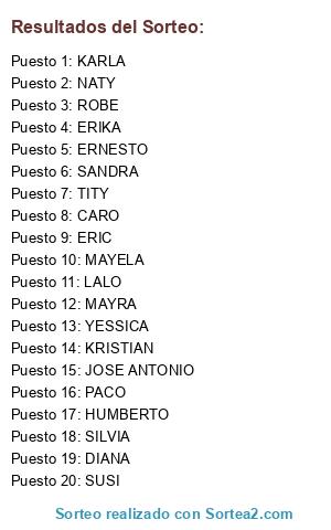 Lista de participantes: MAYELA, KRISTIAN, ERIC, MAYRA, JOSE ANTONIO, ERNESTO, CARO, SANDRA, ERIKA, KARLA, SILVIA, TITY, ROBE, PACO, HUMBERTO, DIANA, SUSI, LALO, YESSICA, NATY.