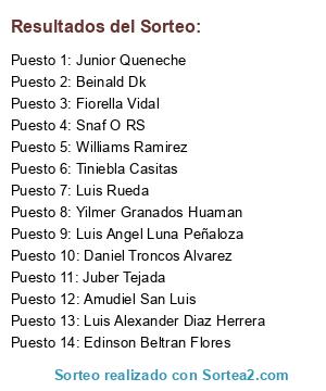 Lista de participantes: Carlos Abad, Juan Nova, Maicol Espinoza, Daniel Troncos Alvarez, Luis Alexander Diaz Herrera, Ronald Enciso, Tommy Gastelu, Delta Jchq, Ronald Yedmin JQ, Omar Tejada Vera, Jarlin Olano, Elmo Blanco Flores, Yeison Brandy CL, Atem Tk, Hugogbjk Hugo, JD Maldonado, Luis Angel Luna Peñaloza, GershoN Ruiz CH, Esteban D. Pérez Astete, Daniel Carpio Carpio, Saimon Darlex, Leo Mondalgo Yauricasa, Jordy Cardenas, Rick Richard, BriianZz Cueva, Einer Dragón Aguilar, Jasper MsLx, Brian Zoto Casanova, Tiniebla Casitas, Paulina Sandra Santos, Jose Luis Sanchez, Popeye Royale, Jose José Santos Pacheco, Julia Santos Pachecho, Distrib Rapi, Franj Osores, Tyrone Casitas, Jose Maria Sifuentes, Julio Casimiro, Jhonny Melgarejo, José FP, Jose Omar Cuba Hernandes, Lopak Tucto Vergara, Kurisu Rakuen, Jim Taylor Jim, Amiga Amistad, Walter Chiquillan, Fatima Quispe Valencia, Beinald Dk, Glover Chávez, Amako BM, David Valencia, Bladii GI, Zahid Villegas Burga, Liz Alicia Gamboa Palomino, Pedro Deza, Soren Dominic, Francis Sanchez Ps, Anthony Cruz Calagua, Compinche Bogdanov, Melanie Darlenne, Cesar Olano, Renato Saravia, Williams Ramirez, Jhan J HQ Tlx, Luis Rueda, Franklin Llerena Alva, Wáltér Méndózá Húámán, Figueroa Torres Jhonny, Henry Luza Ortega, Cristian Joel Menacho, Jhamir Acuña Peralta, Luigui Delgado Llerena, Cristofer Villegas, Wander Parck, Jesus AGuilar Villalobos, Christian De La Rosa, Snaf O RS, TeoGamer Tijero, Jorel Delgado Arancibia, Cesar Eduar Llerena Alva, Edgar Villanueva Sarmiento, Alejandro Tapia, Piter Terrones, Carloz Marcas, Franklin Ochoa, Tembleke D. Ram Car, Dunkalion Bulls Peru, H-c RA Wizz, Carlos Olivero, Fiorella Vidal, Rossy Valverde Dominguez, Amudiel San Luis, Edgar Daniel Solis, Elizabeth Lastre, Arnold Llerena Alva, Ronald Michael Muñoz Soto, Ulises Quiroz AL, Victor Manuel Apaza, Aldana Daniel, Elmer Flores Policarpo, Ariel Alvaro Salazar, Junior Queneche, Kirito Tk, Julio Cueva, Arturo Pca, Jhair Llerena, Rodrigo Estevez Carmen, Denis Ram-Car, Ángel Zambrano, Shon FN, Julio Amber Ztone Banda Granados, Jhon A RC, Alder PB, Dick Castro, Santos Guillén Ramírez, Karloz Uchiha de Konoha, Joseph Muje Ramos, Jhon Pariona Asto, Carlos Garcia, Jose Quisi, Daniel Vásquez Burga, Rodrigo Xavier Palma, Sebastian Villacorta Orosco, Flor Adriana Rojas Rueda, Aaron Ross, Gelber Rodriguez Fernandez, Mario Lopez, Diego Raul Robles Gonzales, Marcelo Armas, Brakan Xz, Barrenechea Chirinos Julian, Anthony Bushito AL, Frank Rodriguez Fernandez, Ander Carbajal Espinoza, Ronal Burga, Job Jojaru, Billy Rodriguez Salirrosas, David Frank Quispe Valencia, Guillermo Hernan Moreano Perez, Edin Cruzado, Giovanni Salazar, Carla Omate Izasola, Dennis TC, Marcelito Enciso H, Diego Chalco Zegarra, Yilmer Granados Huaman, Oscar Luis Santamaria Aguilar, Luciano Salvador, Jhon CM, Daniel Mendoza Mallcco, Jhan Pool Huamali Carhuachin, Diego Yauris, Paul Maycol Sibana, Riley Olivero, Marko Ampuero, Marlon Mcs, Jim Jimenez, Christian Tijero Villanueva, Smith Brayan, David David, Manolito BM, Diego Emzo Malma Taca, Luis Aguirre, Danny Rayan Cardenas Perez, Jose Luis Cabrera Huacho, Alvarado Gordillo Dangelo, Angelo Ramirez, Martin Pérez, Abner Rodriguez Mendoza, Alex Chumpitaz, Jimixitho Cigueñas Perez, Diego Avalos Barrantes, Dremy SeiYa Bautista P, Max Heinrich RM, Eduardo JL, Alexander Tamayo Vidal, Juber Tejada, Marco Calderon Vargas, Ivan Zá Pinto, Jesus Alonso, INeed San Luis, Kevin Arturo Rivadeneyra Inga, Crash Skr, Edison Matos, Felix ParejaHuaman, Frank Fabricio, Richarfex Huaripata Peralta, Ada Gabriela Hermoza Melendez, Michelo Angelo, Samuel Vela Panduro, Jhosmel Vàsquez R, Dwight Brandich, Santiago Suarez, Kevin Capcha Colán, Theshark Agnis, Favio Castillo Leiva, Edinson Beltran Flores, Guillermo Tapia Navarro, Walter Venegas Morales, Renato Andre Villavicencio Ruiz, Gonzalo Torres, Gerard Castrejón, Oli Max Sinche, Gabriel JaiMe, Alex Quijandria, Mitchell Astopilco, Sergio Martin Alvarado Càceda, Axel Gamarra Paredes, Alan Cueva Bermudez.