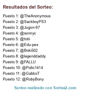Lista de participantes: @machacasaurio20 , @totii , @Loscampeones13 , @SackboyPS3 , @GabboT , @Pollo1414 , @RobyBony , @TheAnonymous, @alexdonos , @Pedromi11 , @Edu-pes , @Pantocrator10 , @chewaka1985 , @legenddaddy , @Nanopes2012 , @RayoVK , @Boki502 , @XX-JaimeR-xX , @FALLU , @sonnyc , @Jugon-97.