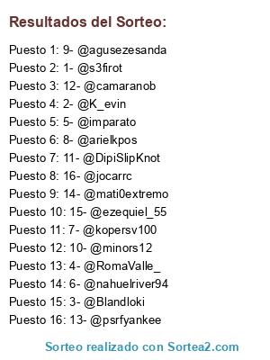 Lista de participantes: 1- @s3firot, 2- @K_evin, 3- @Blandloki, 4- @RomaValle_, 5- @imparato, 6- @nahuelriver94, 7- @kopersv100, 8- @arielkpos, 9- @agusezesanda, 10- @minors12, 11- @DipiSlipKnot, 12- @camaranob, 13- @psrfyankee, 14- @mati0extremo, 15- @ezequiel_55, 16- @jocarrc.