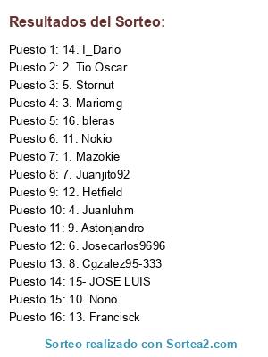 Lista de participantes: 1. Mazokie, 2. Tio Oscar, 3. Mariomg, 4. Juanluhm, 5. Stornut, 6. Josecarlos9696, 7. Juanjito92, 8. Cgzalez95-333, 9. Astonjandro, 10. Nono, 11. Nokio, 12. Hetfield, 13. Francisck, 14. I_Dario, 15- JOSE LUIS, 16. bleras.