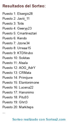 Lista de participantes: Cmartineztari, Vodotuf, Xango08, OscarBale11, Urreaa15, Elantonimone, Morci, Aleex23, Sokitas, Lanun10, Vertix, Geeryy23, Kendo, Alsala, Ghrt3, Wisiko, Diegorro, Elsergio28, Totis, Lucena22, MILINKO_PANTIC, Markiteps, Chorrita, Hanonimo, Primijuve, Pitu93, Jzone34, KTDNrubo, Javiii_11, AOG_AdrY, CRMata, LIBRE.