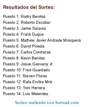Lista de participantes: Fred Guardado, Rodry Benitez, Carlos Contreras, Roberto Escobar, Frank Duque, David Pineda, Rafa Enrike Mrtz, Luis Melendez, Josue Geovany Jr, Kevin Benitez, Yoni Herrera, Steven Flores, Jaime Saravia, Mathew Javier Andrade Mosquera.