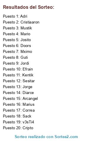 Lista de participantes: Kentik, Adri, Mustik, Guti, Diarce, Mximo, Jorge, Jordi, Correa, Cripto, v3sTi4, Mario, Sack, Arcangel, Sesitar, Doors, Josito, Cristiaaron, Efrain, Marius.