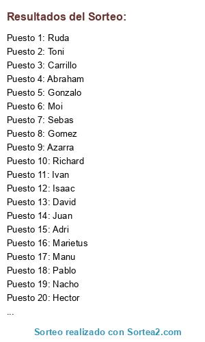 Lista de participantes: Diego, Marietus, Hector, Richard, Nacho, Carrillo, Gonzalo, Pablo, Abraham, Moi, Ivan, Gomez, Juan, David, Paco, Toni, Azarra, Sebas, Adri, Ruda, Manu, Alberto, Silva, Isaac.