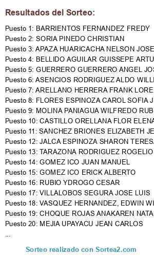 Lista de participantes: ABANTO VERA ANA MARCIEL, ABON GOMEZ GUSTAVO LEONARDO, AGUILAR QUISPE LUIS ORLANDO, ALBORNOZ DOMINGUEZ ABNER AQUILES, ALBUJAR OVIEDO ROY YORDIN, ALBUJAR TORRES FRANCISCO MIGUEL, ALVARADO LLATANCE DANY, ANDRADE HUAMAN YAMINA, ARAKAKI SETO JORGE ALEJANDRO, ARCELA RETAMOZO HUGO ROLANDO, ARDILES REYES ROCIO DEL PILAR, ARELLANO HERRERA FRANK LORENZO, ARENAS EULATTH ELIZABETH ALITHÚ, ARIAS FERNANDEZ FRANCK JHEFERSON, ASENCIOS RODRIGUEZ ALDO WILLIAMS, BENITES CONDORI CRISTIAN ADRIEL, BENITO ORELLANA ALDO ENRIQUE, BERNARDO EUSEBIO LUIS FRANCISCO, BOULANGGER YAÑEZ BRENDA MABEL, BRAVO URBIOLA CHRISTIAN DARU, CABALLERO HUIMAN ESTEFANY ALEXANDRA, CABRERA GALLEGOS JOSE GUILLERMO, CALDERON BARTRA JOSE LUIS FRANCO, CAMPOS AVILA JOSE ALBERTO, CARBAJAL CANOVA EDGARD PAOLO, CARDENAS ARICA SAMANTHA ALEXANDRA, CARDENAS RAMON GARRY FREDDY, CARMONA YATACO DEBORA CECILIA, CARPIO VALDERRAMA RENATO ALONSO, CARRERA ESPINOZA CARMEN ESTEFANY, CARRILLO ESPINOZA HUGO, CARVALLO CASTRO GABRIELLE ANDREA, CASAS MALLMA ROSARIO JUDITH, CASTAÑEDA CHAVEZ JHAN RENZO, CASTILLO ORELLANA FLOR ELENA, CEPEDA CAVERO LUIS ENRIQUE, CESPEDES QUIMPER RAFAEL EDUARDO, CHANG VARGAS FRANK VICENTE, CHEE CUCALON CHRISTIAN, CHIRINOS CEPEDA KARINA NATALIA, CHOLAN FALCON JHOSELYN ALESSANDRA, CHOQUE ROJAS ANAKAREN NATALY, CLEMENTE MUSAYON GISELA DIANA, CORBERA TERRONES WILSON JAZIER, CORDOVA AYRA CYNTHIA ALICE, DEXTRE MORI KORI CAROLINA, DIAZ QUILCATE REGINA, ECHEGARAY ORTIZ DE ORUE JERSON JESU, EGO-AGUIRRE COLONIA ANDREA PIERINA, ESPEJO FERNANDEZ CABERO DE VILDOSO CARLA GIOVANNA, ESPINOZA VARGAS FELIPE ALEJANDRO, FALLA GASTULO JORGE DANIEL FERNANDO, FLOR SANCHEZ DIANA TERESA, FLORES ESPINOZA CAROL SOFIA JEANETTE, FLORES MARTINEZ PETER NOBEL, FUKUMOTO CHAVEZ CARLOS KIYOSHI, GADEA EYZAGUIRRE MAGALI MARIELA, GALINDO TIPIAN PATRICIA LISETH, GALLARDO BALDOCEDA GUILLERMO EDGARD, GAMARRA QUINTANA JOSE ALBERTO, GAMARRA VILLANUEVA CONNIE LIA, GAMBOA MORENO KIARA DENISSE, GARAY HIDALGO LUIS ENRIQUE, GARCIA OSTOLAZA GLORIA ELVIRA, GOMEZ ICO ERICK ALBERTO, GOMEZ ICO JUAN MANUEL, GONZALES OSPINA NATALIE STEFANIA, GRANDEZ MANUYAMA JHON MAY, GUERRA CASTANEDA CARLOS ENRIQUE, GUERRA KAQUI JORGE AKIO, GUEVARA AMORETTI SAMMY ALONSO, GUTIERREZ ESPINOZA HAIRO ALAN, HAUYON WENINGER YOLANDA VANESSA, HERRERA TOSCAINO CHRISTIAN MAURICIO, HERRERA VILCHEZ VANIA DEL CARMEN, HUACHO FLORES FRANKS JONATHAN, HUAMAN CAVIEDES HEIDY LISETH, HUAMAN MESIAS GLEDY YESENIA, HUAMAN POMA JAVIER, HUARCAYA ESPINOZA LUIS ANTONIO, HUERTA CACHA ADOLFO CESAR, HUINGO LLICO LUIS ALBERTO, ILLATOPA ANTUNEZ ALFREDO, JALCA ESPINOZA SHARON TERESA, JULCA CALDERON ANGEL JAVIER, LANCHIPA LANCHIPA VICTOR JESUS, LAZO ECHEGARAY ROSA MARIA, LAZO GARCIA NUTTSY AURORA, LETONA COLLANTES PAOLO ALFREDO, LIMAYLLA RODRIGUEZ WENDY ZORAIDA, LOPEZ FLORES EMMELINE, LOPEZ NICOLINI CESAR AUGUSTO, LOSSIO GONZALEZ DEL VALLE FIORELLA, MACEDO PANTOJA MAVILA CLAUDIA, MACHADO ZAPATA DORAGILDA LILIANA, MALLQUI VILCA SINTIA, MANSILLA URPI RUDY FRANCISCO, MEDINA NAKAMINE FRANKLIN DAVID, MEDINA VALDIVIA CIRO JESUS, MENDOZA CARRASCO ALFREDO, MOLINA PANIAGUA WILFREDO RUBEN, MORE CALDERON DAVID SANTIAGO, MORI GAMARRA GIANFRANCO WILFREDO, MOTTA TAMARA JUDITH ROXANA, MUÑOZ CASTRO ROXY JAZMIN, NAVARRO INGA MARCO ANTONIO, ÑAUPARI VELA CHERLY AKEMI, OJEDA REQUENA EVELYN CHRISTIE, ORIHUELA NORIEGA GABY MARIETTE, ORTIZ CÁRDENAS ANDREA MÁLORI, OSCCO QUINCHO VICTOR DANIEL, OSTOS DE LA ROSA JAIME DANTE, OVALLE PINEDO JOAO FRANCISCO, PACHAS MATIAS MARCO JESUS, PACO HUANACUNI JAVIER ANTONIO, PAREDES LUNA LYNDA, PARIASCA RODRIGUEZ AMMY KIERSTHEN, PENAS PRADO PAMELA LIZETH, PEÑARANDA BUENAÑO CHRISTIAN HECTOR, PEREZ HUAPAYA ETERI WALID, PERICHE RAMOS JAVIER ARTURO, PIÑA VARGAS LESLY MARYORI, PUN GOMEZ CRISTHIAN MANUEL, QUIÑONES MORALES MARICARMEN NASLA, QUIROS CUBILLAS GUILLERMO ALBERTO, QUISPE MILLA CINTHYA GIANNINA, RAMIREZ ESPINOZA JESUS FERNANDO, RAMIREZ GARCIA NANCY JANET, REVOREDO IZQUIERDO JUAN KEITH, REYES PALOMINO VICTOR MANUEL, RIVAS SUAREZ YORMAN, RIVERA SARMIENTO DIANA CAROLINA, RODRIGUEZ ALÁ BILLY EDUARDO, RODRIGUEZ AYALA JUAN FRANCISCO, RODRIGUEZ LLERENA JOSE ANTONIO, ROJAS URIARTE DIANA CLAUDIA, ROMERO GUIA YVETH FIORELLA, ROMERO MONTERO MARIA CONSUELO, RONDON PEÑA OLENKA LOURDES, ROQUE MAMANI DAVID GUSTAVO, ROSALES ROJAS ESTEBAN, RUBIO YDROGO CESAR, RUIZ SANCHEZ SALAZAR JAVIER ERNESTO, SAIRE HUALLPA NATALY BANESSA, SALAMANCA VELASQUEZ MARIO, SALAS FLOREZ GABRIEL, SALAZAR MURGUIA JOHAN GIANCARLO, SANCHEZ ABANTO CARLOS GERMAN, SANCHEZ LLERENA BRAULIO, SANCHEZ MARIN ALBERTH, SANDOVAL BALDERA JOSE LUIS, SANDOVAL YPANAQUE MILAGROS, SANTA MARIA NORABUENA ALBERTO RAFAEL, SANTAYANA VELA ROSENDO RUFINO, SARMIENTO MELGAREJO CARLOS ALEJANDRO, SCOTT CASTAÑON LORRAINE CECILIA, SILVA YEN EDGARD MAXIMO, SOLIS TORRES JOSE LUIS, SORIA PINEDO CHRISTIAN, TELLO GARCIA ENITH, TEMOCHE SALAZAR MARIA LUISA, TORRES CAMPOS ERMAN, TORRES CHARA MIGUEL MOISES, TRUJILLO PALOMINO ANAIS PAULA, UCHUYA SOLGORRE JUAN JESUS, VALLENAS ROMERO VANESSA DENISSE, VASQUEZ CAPCHA DORA MILAGROS, VASQUEZ FREYRE HUMBERTO JOSE, VELASQUEZ GRANDEZ LILIAN MILAGROS, VELAZCO FLORES MANUEL JESUS, VERA TORREBLANCA IVAN, VERGARA FERNANDEZ JAVIER, VIERA REQUENA CLAUDIA JOHANA, VILLALOBOS SEGURA JOSE LUIS, VILLAR CARITAS TANIA LIA, WINCHONLONG SANDOVAL HENRY ALBERTO, YANCCE CRISANTE CRISTIAN ANIBAL, YNOSTROZA FERNANDEZ DIANA MARGOT, ZAFRA SIANCAS HENRRY DANIEL, ZARATE INFANTE TALIA, ZEVALLOS RIVERO CARLOS EUGENIO, ZUÑIGA ARIAS KATHERINE MILAGROS, ROHRSTOCK X ARIEH, ACOSTA HERRERA GISELLA NILDA, AGUILAR ZAVALA BRENDA ESTHER, ALVARADO REVILLA SAMUEL RODOLFO, ALVAREZ ARELLANO ANDY, ALVAREZ VENTOCILLA YEVIT AMPARO, ANDIA MEDINA GUSTAVO ALONSO, APARICIO AMPUERO IVAN MARCELO, APAZA HUARICACHA NELSON JOSE, ARROYO MENDOZA LUCILA JAZMIN, ASPAJO ARIAS JOSE ALBERTO, BARRIENTOS FERNANDEZ FREDY, BELLIDO AGUILAR GUISSEPE ARTURO, BONIFACIO GUIZADO MAVERICK CHILAVERT, CALLE LOPEZ PERCY, CAMACHO ALFARO WALTER, CARDENAS TAIPE SHELSY MARIANA, CARRERA SALAS CECILIA GIA