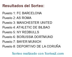 Lista de participantes: ATHLETIC DE BILBAO, BAYER MUNICH, BORUSSIA DORTMUND, NY REDBULLS, DEPORTIVO DE LA CORUÑA, AS ROMA, FC BARCELONA, MANCHESTER UNITED.