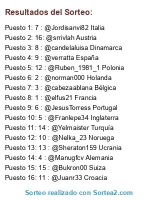 Lista de participantes: 1 : @elfus21 Francia, 2 : @norman000 Holanda, 3 : @cabezaablana Bélgica, 4 : @Manugfcv Alemania, 5 : @Franlepe34 Inglaterra, 6 : @JesusTorress Portugal, 7 : @Jordisanvi82 Italia, 8 : @candelaluisa Dinamarca, 9 : @verratta España, 10 : @Nelka_23 Noruega, 11 : @Juanr33 Croacia, 12 : @Ruben_1981_1 Polonia, 13 : @Sheraton159 Ucrania, 14 : @Yelmaister Turquía, 15 : @Bukron00 Suiza, 16: @srrivlah Austria.