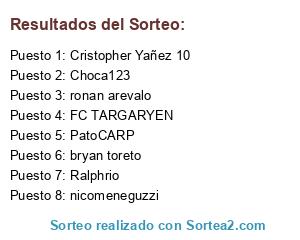 Lista de participantes: Cristopher Yañez 10, bryan toreto, Choca123, Ralphrio, PatoCARP, ronan arevalo, FC TARGARYEN, nicomeneguzzi.