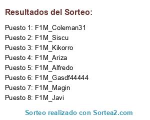 Lista de participantes: F1M_Kikorro, F1M_Javi, F1M_Alfredo, F1M_Gasdf44444, F1M_Coleman31, F1M_Siscu, F1M_Ariza, F1M_Magin.