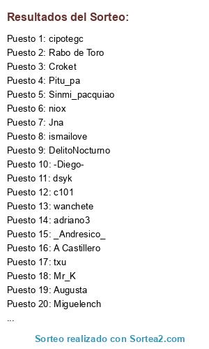 Lista de participantes: Shur/b/tard, Croket, Miguelench, SkyHighRecords(3 participaciones), Neider, Ulver, vsher14, DJViagra(2 participaciones), cipotegc, dddaaannniii, jacorral, nelson10, isnotavail, cojonante, alfredo1769, Jna(2 participaciones), Mr_K, Rabo de Toro, Sinmi_pacquiao, smail, ismailove, vossler, Freakish, MetalDark, A.Soria, -Diego-, dubisport, txu, Stockyards, Wilkins, c101, envivism, YuRkLi, Alistair, dsyk, Magnosito, DelitoNocturno(3 participaciones), Susaeta17, denisdj, PUCH, rySeeR, .eksecution, A Castillero, adriano3(5 participaciones), Senlle, ryan86, cordoba_091, Pitu_pa, kitus9, Becquerel, Emex9103, Campi_racing, cesar_vk, niox, Creativ3, Augusta(2 participaciones), wanchete, _Andresico_, Ezio_Auditore, Jose Samar, capko.