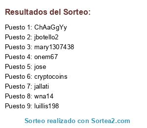 Lista de participantes: jallati, jose, ChAaGgYy, wna14, jbotello2, onem67, mary1307438, cryptocoins, luillis198.