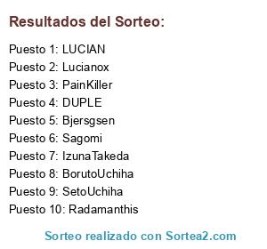 Lista de participantes: Sagomi(3), DUPLE(3), PainKiller(4), AjmS(2), Bjersgsen(2), Lucianox(6), LUCIAN(4), Radamanthis(3), BorutoUchiha(1), SetoUchiha(1), IzunaTakeda(2), Rufio(1), LDBM(1).