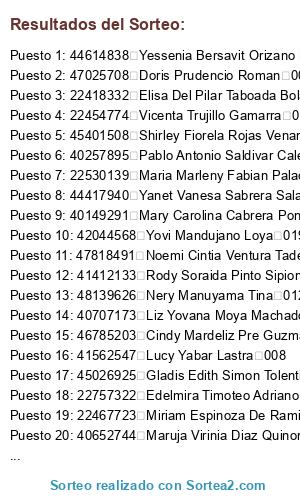 Lista de participantes: 76432226 Abigaid Deisy Crespo Palermo 005, 40151656 Adela Venturo Hermosilla 019, 61103172 Adrianna Mayte Rutti Chavez 006, 22420224 Alejandra Teresa Toledo Minaya 006, 44724882 Alicia Ponce Alminco 005, 46862418 Ana Jackeline Avelino Velasquez 002, 22493823 Ana Maria Blas Alipasaga 018, 41741978 Angela Miriam Salazar Condezo 017, 22477254 Angelica Maria Tolentino Leon 008, 04078881 Antonia Espinoza Arias 002, 76565245 Aracely Manuela Chocano Avila 013, 40415342 Armin Laurencio Dionisio 017, 76835547 Ayda Maricruz Laveriano Huaranga 006, 47735117 Aydhe Gisela Gregorio Tello 002, 40636194 Bersely Guerrero Flores 019, 46749144 Betsy Magaly Zevallos Yalico 002, 73345058 Bety Cesy Chaco Arratea 013, 42532384 Caetana Isla Figueroa 008, 04018048 Carlota Cilio De 019, 44809041 Carmela Zurisadai Aliaga Gallardo 002, 22400336 Carmen Ortiz Salas 016, 22487280 Carmen Ynes Sheffer Huaman 014, 77805141 Carolina Esmeralda Anaclo Luna 013, 42699596 Celestina Avelino Concha 011, 73596078 Charli Javier Martel Enrique 001, 46700751 Cinthia Yanina Hinostroza Espinoza 002, 42503202 Cinthya Dolly Zelaya Baldeon 014, 40074922 Claudia Carola Herrera Rosas 008, 22489260 Cledy Mabel Rosales Flores 011, 22403350 Concepcion Valentina Cabanillas Malpartida 013, 40173966 Cristina Dina Justo Lastra 008, 76856251 Dalia Nashali Huaman Celis 002, 72487997 Dayra Alannis Yersely Aquino Leon 017, 22511188 Delia Cristina Munguia Agui 006, 41798672 Dency Ortiz Ponciano 013, 22505330 Dina Ursula Fuentes Gomez 017, 47522255 Dindra Indira Apac Rivera 008, 20606743140 Distribuidora E Inversion Empresa Individual De Res 008, 22475855 Dolores Rivera De Gomez 013, 44373000 Domitila Zevallos Yalico 002, 71303157 Efrain Valerio Vilchez Gregorio 002, 22418332 Elisa Del Pilar Taboada Bolarte 008, 74553666 Elisa Yaneth Tolentino Capcha 017, 42116253 Elizabeth Huarcayo Santa 002, 43348327 Elizabeth Marilin Ramirez Ponce 013, 41366834 Elva Lizhet Carbajal Zevallos 011, 40652747 Erika Pilar Rodriguez Figueroa 019, 23018197 Esther Pilar Valdivia Martel 011, 22960988 Faustina Cruz De 013, 40650715 Filomena Sadith Santillan Gonzales 005, 22420290 Flora Alva De Delgado 011, 10286990 Florencia Margarita Castaneda Montero 011, 73620557 Floricel Neyva Serrano Cajas 002, 60481045 Fredy Jesus Huaman Nunez 010, 22503135 Frida Veronica Marrujo Orbezo 006, 71398650 Gaby Delina Janampa Rufino 010, 22512280 Gilda July Espejo Robles 006, 76170229 Giovana Esmeralda Santos Castaneda 013, 45097352 Gisella Vela Perez 013, 46455337 Gladis Alcira Cachay Arias 002, 04056287 Glicerio Salcedo Grados 008, 22497064 Grimanesa Rosa Anaya Espinoza 008, 22421213 Gudelia Suarez Rodriguez 006, 04006774 Guirnalda Valentina Matos Gonzales 014, 43383310 Hady Brinda Segura Huamalias 014, 04083196 Herlinda Luzbal Campos Perez 017, 22675906 Hilda Espinoza Aliaga 010, 44037651 Hisela Yobana Rios Ventocilla 002, 22501892 Ignacia Presentacion Rivera 002, 43161657 Iliana Lisseth Escobal Mendez 002, 76878894 Iralia Guerrero Chuquihuanga 014, 08399334 Isabel Eufrosina Chavez Lagos 002, 74553093 Isabel Yudi Lucas Trujillo 002, 22407371 Ivonne Maritza Ramirez Claud 008, 80490015 Jacqueline Juliana Bartra Alvarado 001, 46923563 Jaqueline Acosta Palacios 002, 76034023 Jazmin Giovana Salis Justo 008, 74083346 Jazmin Kimberly Romero Cori 014, 22460722 Jeny Lozan Tanjun 006, 41961249 Jessica Carol Preza Villanueva 002, 76876517 Jesus Carhuas 008, 44242582 Jhanet Mercedes Chamorro Castillo 019, 43341064 Jina Juliana Chavez Palacios 017, 47715059 Joel Henry Calero Ventura 008, 22418699 Juana Esperanza Las Cariga 006, 71490869 Judhy Alvarez Campos 014, 22493328 Judith Esterher Chavez Pena 006, 47010080 Karen Laura Ventura Guerra 002, 48352393 Karen Yeraldine Fuentes Garcia 006, 70679969 Karla Nalvarte Salazar 013, 71305780 Katherin Katiusca Tarazona Lozano 010, 75821066 Katherin Manuela Mendieta Figueredo 011, 45583192 Katheryne Pilar Luis Gavino 008, 44235197 Katty Olivia Huaman Esteban 005, 44959954 Keila Guisela Acosta Ramos 008, 72274002 Kely Carina Salvador Canchari 013, 22509851 Ketty Bonilla Paredes 006, 40841255 Layda Dora Santamaria Beteta 005, 47534661 Leydi Karol Flores Albornoz 014, 45986360 Lila Leon Echevarria 005, 40448721 Lili Marnit Valdivia Ortiz 008, 22675141 Lilia Lucy Rubin Tello 002, 44940496 Linda Rossi Huaman Cruz 014, 46539481 Liz Andrea Montesinos Lugo 002, 10726563 Liz Claide Soto Santiago 019, 22489551 Liz Justiniano Concepcion 017, 47303628 Liz Miriam Aguirre Pardave 008, 76136345 Lizbeth Geranio Nazario 006, 48829243 Loreta Malpartida Soria 006, 41528194 Lucy Isidro Encarnacion 013, 71986792 Lucy Tania Chavez Garcia 002, 22489146 Luis Alberto Alcedo Malpartida 006, 22488595 Luz Roxana Crespo Lugo 006, 74051672 Lys Lucia Salazar Reyes 013, 71892438 Maily Sayuri Flores Dionicio 019, 43023254 Maria Ines Alvarado Santos 006, 77501724 Maria Magdalena Albornoz Cornelio 001, 22530139 Maria Marleny Fabian Palacios 019, 006496371 Maria Mercedes Calderon Figueredo 011, 71870053 Mariany Kate Chagua Soto 019, 41170962 Maribel Torres Toledo 019, 41412142 Marilu Sandra Alcantara Chamorro De Bau 011, 74572390 Mariluz Cisneros Casimiro 010, 44949091 Marivel Lavado Albornoz 017, 22517556 Marli Bocanegra Del Castillo 013, 46337076 Marlith Espinoza Cueva 014, 41337924 Martel Rodriguez Chavez 013, 22430172 Martha Claudia Nunez Rosales 006, 22464163 Martha Lastra Galvez 008, 42178548 Martina Andrade Fretel 010, 40890491 Martina Crespo Tarazona 011, 22508389 Maruja Mendieta Huaytan 011, 22444627 Maximina Llanos Norena 005, 40394615 Milagros Del Pilar Sandoval Silvestre 006, 77674487 Milagros Norena Masgo 017, 71474655 Milagros Ysabel Alvarado Chavez 002, 21137823 Mirtha Aymin Francia Mayorca 006, 22475754 Nanci Lourdes Leon Obregon 001, 22961413 Nancy Gallardo Saavedra 001, 22413517 Nelida Doroteo Hilario 001, 22510419 Nila Efilia Lucas Gonzales 001, 22513362 Olga Medina Montes 008, 44009719 Olinda Zoila Obregon Gonzales 019, 74077813 Pamela Serafico Isidro 014