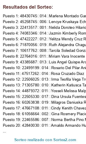 - Puesto 20: 42840030 011 Arnaldo Armando Huaqui Romero