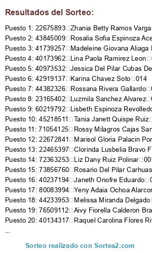 Lista de participantes: 42067338 Adelina Apac Cantaro Torres 001, 22515479 Agustina Gaspar Valerio 006, 76509112 Aivy Fiorella Calderon Bravo 018, 22422263 Alberta G Manzano Tarazona 018, 22518457 Alejandra Maritza Falconi Ancajina 006, 22420224 Alejandra Teresa Toledo Minaya 006, 40376355 Alfonsa Juipa Neira 006, 41601609 Alfredo Valois Dominguez Rosales 009, 22473962 Alicia Avila Jesus 019, 45399169 Alicia Lidia Barrueta Claudio 011, 40618293 Alicia Solano Corcino 009, 22643094 Amelia Bravo Cespedes De Orbezo 004, 41638774 Ana Monica Pardave Vergara 018, 42728255 Andrea Maribel Zamudio Orbezo 016, 41741978 Angela Miriam Salazar Condezo 017, 46853063 Angelica Cabrera Albornoz 006, 75774906 Angelica Diaz Espinoza 018, 22477254 Angelica Maria Tolentino Leon 018, 48730684 Angi Dayana Zevallos Presentacion 014, 47284943 Anyela Espiritu Huaman 005, 48665601 Astrid Karolina Malpartida Malpartida 009, 22484746 Aurelia Falcon Pinan 008, 42150579 Avi Griselda Aponte Vega 011, 72714681 Ayda Felipa Trujillo Carbajal 002, 22498974 Bedzabet Garay Urbina 006, 40523765 Bertha Elvira Sanchez Calero 012, 71199595 Betsy Olenka Acero Dominguez 012, 22517467 Blanca Deny Noblejas Cabrera 006, 22408901 Blanca Violeta Bustamante Loarte 006, 75366218 Brayan Antony Ureta Alcedo 016, 46902921 Brett Luzzanrdi Evaristo Valentin 007, 73614693 Briggitte Andrea Jimenez Lastra 004, 75010710 Camila Ailen Bernaola Santos 010, 22750777 Candelaria Lorenza Basillo Cespedes 006, 22641064 Carmela Gallardo Cajas 002, 22518924 Carmen Rosa Miranda Gonzalez 019, 73384799 Cassandra Marielena Inostroza Ramirez 011, 71610325 Cecilia Yalico Hilario 017, 22499393 Celia Cruz Aguirre 014, 22429097 Celia Irma Vicente Yumpe 005, 22500001 Cledida Rosa Quiroz Tucto 018, 22504990 Clelia Martinez Montes 006, 80006920 Clenda Orfila Cierto Berrospi 005, 22465397 Clorinda Lusbelia Bravo Figueroa 018, 22403350 Concepcion Valentina Cabanillas Malpartida 018, 47240211 Crecia Thalia Trujillo Melchor 007, 77696939 Dalila Epifania Justo Rafael 014, 41411694 Dalmiro Daniel Roque Palpa 014, 40695605 Danitza Danesa Asca Morales 014, 72487997 Dayra Alannis Yersely Aquino Leon 009, 45449742 Deisy Edith Bustamante Madrid 019, 41135539 Delcy Nydia Pozo Meza 019, 22419488 Delia Alejo Tumbay 001, 22511188 Delia Cristina Munguia Agui 006, 44503594 Denis Shara Rasales Morales 013, 47762422 Deysi Mayken Gaspar Ponce 002, 44561702 Deysi Ruiz Hoyos 017, 44782984 Diana Blas Seferino 010, 44864642 Diana Carolina Campos Firma 012, 22507309 Diana Esther Soto Coz 013, 45800864 Diana Grisenia Cespedes Cespedes 012, 41086178 Diana Lizbeth Daza Perez 007, 40351151 Diana Lourdes Trujillo Argandona 001, 45195137 Diana Shirley Chavez Flores 017, 22449908 Dora Celia Gone Blas 012, 46892649 Dyancaro Palpan Valer 002, 22757322 Edelmira Timoteo Adriano 001, 40680837 Elcira Lozano Castro 002, 22470447 Elizabeth Cabrera Castaneda 001, 40631886 Elizabeth Calderon Eduardo 006, 43056952 Elsa Milagros Fabian Calero 018, 22511221 Elvira Madeleine Ampuola Bonar 011, 42704385 Elzabeth Jakelin Ramirez Caceres 006, 22666532 Erika Escobar Rojas 004, 22497160 Erlinda Nolasco Bravo 011, 74686189 Esmeralda Gomez Medina 018, 71788420 Esmeralda Judith Cuellar Martinez 002, 04017638 Espejo Robles Belarmina 006, 43103698 Esther Aranda Mendoza 002, 72295141 Estrella Lucero Nunez Velez De Villa 013, 46134277 Eufemia Leonora Carranza Iparraguirre 018, 42687593 Fatima Eleximia Montero Follegati 019, 22461307 Florinda Gonzales Venturo 012, 75958828 Francesca Tarazona Tarazona 016, 42482261 Frida Condezo Avila 001, 22512280 Gilda July Espejo Robles 006, 42067045 Gioliana Tapullima Isuiza 016, 45831157 Gisela Salazar Cantaro 005, 22640368 Gladis Serrano Jara 002, 22430318 Gloria Lucia Rojas Martinez 001, 44770127 Guicela Llanos De Lao 005, 22666624 Herlinda Carmen Nolasco Camacho 018, 41776437 Hilda Jacinta Salazar Vitorino 004, 22432731 Hilda Judith Ramos Paucar 014, 22400591 Hortencia Zevallos Garcia 001, 46264233 Ibeth Teresa Lozano Leon 006, 75241933 Idelia Esteban Aro 019, 71660046 Ingrid Selene Acuna Crespo 016, 47795505 Irma Olinda Rosas Estela 009, 22400169 Isabel Millan Mori 011, 22503260 Jacqueline Isabel Vasquez Escobal 001, 40422574 Jacqueline Marleni Tarazona Rojas 001, 40553368 Jacqueline Sara Cespedes Ceferino 010, 43752971 Janeth Eveling Chavez Quijano 010, 40237194 Janeth Onofre Eduardo 018, 47570152 Janeth Rocio Espinoza Cerrano 011, 75724064 Jannelly Erlinda Ugarte Arostegui 014, 73788718 Jaquelin Erody Barbaran Moreno 006, 22508220 Jeanette Echevarria Laos 006, 46048778 Jennifer Nohely Scharff Reategui 016, 40973532 Jessica Del Pilar Cubas Delgado 014, 44002713 Jessica Rocio Atencio Gonzales 018, 42250339 Jharitza Jhulie Quijano Malpartida 010, 46039305 Jhonattan Jose Marquez Ruiz 011, 40422556 Joanna Melissa Orbezo Bravo 004, 47690377 Jossely Jioana Minaya Chavez 014, 77430194 Jossy Flint Arostegui Gudeno 001, 75979010 Juan Benigno Huaman Orihuela 016, 22521851 Juan Eduardo Mosquera Espinoza 011, 71300608 Judith Medalith Cajas Culantres 019, 41496710 Judith Soto Ayala 016, 04221261 Judith Valle Canchari 005, 09953977 Julia Maximina Fernandez Flores 018, 76323655 Juliana Cajalin Trujillo 011, 45965997 Justina Susi Alcedo Aliaga 014, 72625182 Karen Margoth Rosas Vara 012, 42919137 Karina Chavez Soto 014, 42298098 Karina Rossana Pinan Soria 013, 46052927 Karina Yudith Santos Apac 007, 75979022 Karla Betzabet Vara Nieves 014, 43680114 Karla Consuelo Gomez Alvarado 006, 70679969 Karla Nalvarte Salazar 013, 46220047 Katherine Claudia Acosta Solis 006, 45626535 Katherine Pamela Pena Ibarra 006, 44959954 Keila Guisela Acosta Ramos 007, 47992295 Kelly Leslly Hurtado Cotrina 013, 41658243 Ketty Bell Lavado Obregon 013, 72424778 Kriss Alessandra Matos Aseijas 017, 74735967 Leonardo James Concha Olivares 008, 46108320 Leonor Arrieta Cornelio 014, 40860707 Leslyee Kely Monteluisa Garcia 010, 75958765 Leticia Yanina Aranda Campos 005, 42636063 Lety Luz Acuna Cuellar 016, 76865743 Leydi Sunmy Truji