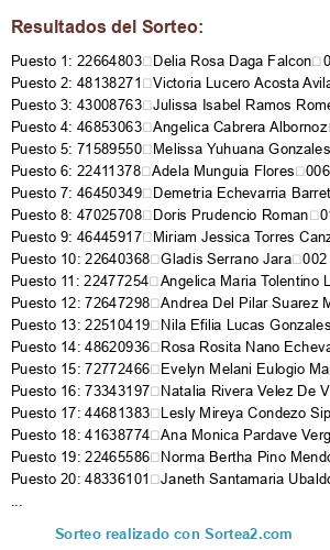 Lista de participantes: 40344560 Abad Rojas Palacios 007, 22411378 Adela Munguia Flores 006, 43513997 Adelayda Pardave Lazaro 018, 22515114 Agripina Lourdes Echevarria Jauregui 008, 76509112 Aivy Fiorella Calderon Bravo 018, 41367646 Alicia Bela Ayllon Ramos 011, 45399169 Alicia Lidia Barrueta Claudio 011, 40618293 Alicia Solano Corcino 009, 22643094 Amelia Bravo Cespedes De Orbezo 004, 44736618 Ana Cecilia Trinidad Nazairo 008, 21258665 Ana Eulalia Hidalgo Arias 001, 41638774 Ana Monica Pardave Vergara 018, 22674149 Anabel Romero Gomez 002, 43761748 Andrea Betzabe Collazos Zambrano 005, 72647298 Andrea Del Pilar Suarez Mory 013, 41741978 Angela Miriam Salazar Condezo 017, 46853063 Angelica Cabrera Albornoz 006, 22477254 Angelica Maria Tolentino Leon 018, 22507493 Angelica Ruth Marin Borunda 012, 70800914 Anmd Jagger Kesvy Hurtado Pimentel 018, 22414040 Aurelia Calderon De Ramirez 018, 22484746 Aurelia Falcon Pinan 008, 45408268 Aurelia Pilar Trujillo Correa 018, 73262097 Ayde Lusmila Atencia Soto 009, 47394604 Azucena Margarita Estraver Valverde 007, 43222716 Beatriz Melany Guillermo Castillo 006, 47978552 Benilda Figueroa Quispe 009, 22960314 Berdith Avila Ramirez 008, 71199595 Betsy Olenka Acero Dominguez 012, 47810103 Beverlyng Julissa Sanchez Quijano 008, 09900243 Blanca Rosa Lopez Malpartida 006, 22408901 Blanca Violeta Bustamante Loarte 006, 75366218 Brayan Antony Ureta Alcedo 016, 42835348 Brenda Karem Carranza Echevarria 001, 46801336 Brenda Nataly Orbezo Bravo 004, 44268408 Brigida Elva Soto Yanac 003, 40398204 Brijida Gamarra Abad 016, 75010710 Camila Ailen Bernaola Santos 010, 22415970 Carmen Diaz Ingunza 006, 22400336 Carmen Ortiz Salas 016, 22518924 Carmen Rosa Miranda Gonzalez 019, 22413604 Carmen Rosa Urdanivia Ramirez 006, 41948575 Cathy Candy Trujillo Galeano 006, 40790329 Cecilia Lissette Suarez Leon 013, 71610325 Cecilia Yalico Hilario 017, 42503202 Cinthya Dolly Zelaya Baldeon 014, 22500001 Cledida Rosa Quiroz Tucto 018, 22465397 Clorinda Lusbelia Bravo Figueroa 018, 22403350 Concepcion Valentina Cabanillas Malpartida 018, 73466211 Creycy Xiomara Romero Rosales 011, 22426519 Dadeyva Medina Castaneda 008, 46590895 Dalina Mallma Malqui 016, 80065439 Dalinda Trinidad Salazar 019, 22647771 Damacia Medrano Ramos 008, 72229973 Damaris Maiz Daga 016, 71695179 Danika Layla Magro Huanca 018, 48320516 Dany Ramirez Simon 001, 72487997 Dayra Alannis Yersely Aquino Leon 015, 45449742 Deisy Edith Bustamante Madrid 019, 22664803 Delia Rosa Daga Falcon 016, 46450349 Demetria Echevarria Barreto 009, 41798672 Dency Ortiz Ponciano 006, 44503594 Denis Shara Rasales Morales 013, 44561702 Deysi Ruiz Hoyos 017, 41086178 Diana Lizbeth Daza Perez 007, 46384680 Dina Lizbet Gomez Carpio 018, 22505330 Dina Ursula Fuentes Gomez 017, 22479662 Diosa Linda Asencio Gonzales 005, 22449908 Dora Celia Gone Blas 012, 22440689 Dora Luz Rivera Trujillo 014, 47025708 Doris Prudencio Roman 013, 22757322 Edelmira Timoteo Adriano 001, 40885150 Edhit Marleny Garcia Jaimes 017, 70032210 Edith Marleny Quispe Casimiro 009, 72375951 Edith Yasdaly Bartolome Tarazona 008, 22483954 Eladia Revolledo De Acosta 019, 40680837 Elcira Lozano Castro 002, 71947748 Eli Eleonor Sampayo Arimuya 019, 22418332 Elisa Del Pilar Taboada Bolarte 012, 76322491 Elisa Estefanis Rosales Malpartida 005, 41152219 Elizabeth Antonia Marchan Valverde 008, 40631886 Elizabeth Calderon Eduardo 006, 44533424 Elizabeth Nelly Carbajal Morales 007, 42741257 Elizabeth Roxana Huaqui Alvarado 012, 22517709 Elizabeth Salazar Crespo 006, 43056952 Elsa Milagros Fabian Calero 018, 75848758 Elvira Romero Valdivia 016, 74498310 Emenis Betsi Capcha Cienfuegos 003, 41974842 Emilia Encarnacion Guerra Paz 014, 22419450 Epifania Andrade Ramos 010, 48251104 Epifania Condezo Morales 007, 22406381 Epifanio Gaudencio Davila Rivera 009, 43146043 Erlinda Esther Herrera Aquino 015, 22513466 Erlinda Irribarren Jurado 008, 22497160 Erlinda Nolasco Bravo 011, 04017638 Espejo Robles Belarmina 006, 72720215 Esthefany Jhenifer Ramos Pinan 017, 43103698 Esther Aranda Mendoza 002, 00996361 Esther Saavedra Jaramillo 018, 72295141 Estrella Lucero Nunez Velez De Villa 013, 72772466 Evelyn Melani Eulogio Martin 005, 22498962 Felisa Cos Maiz De Soto 017, 40650715 Filomena Sadith Santillan Gonzales 019, 47449214 Flor Elena Ramos Ribera 006, 73786886 Flor Marlita Ayra Rueda 007, 77046717 Flor Mercedes Munaico Chogas 011, 25846954 Flor Selene Sanchez Solis 006, 45271573 Flora Pilar Barredo Simon 017, 46778172 Florecina Espinoza Vilca 019, 22461307 Florinda Gonzales Venturo 012, 22509959 Fortunato Echeverria Santillan 008, 70861507 Franliz Lilian Vargas Durand 014, 42482261 Frida Condezo Avila 001, 22512280 Gilda July Espejo Robles 006, 45026925 Gladis Edith Simon Tolentino 015, 22474224 Gladis Otilia Solorzano Armas 007, 22640368 Gladis Serrano Jara 002, 44770127 Guicela Llanos De Lao 005, 22666485 Guillermina Filomena Francisco Centeno 017, 22508779 Guillermo Lavy Fretel Magarino 018, 45863780 Guissela Isabel Tucto Cruz 010, 22486355 Helen Nalda Acevedo Laguna 014, 22666624 Herlinda Carmen Nolasco Camacho 018, 41776437 Hilda Jacinta Salazar Vitorino 004, 22485360 Holinda Fabian Huerta De Apac 018, 22400591 Hortencia Zevallos Garcia 001, 72879224 Ihianela Valeryn Claudio Nieves 009, 47657788 Ines Flores Picon 011, 46744956 Ines Norena Panduro 008, 44582054 Ingrid Pio Inocencio 008, 77023892 Iris Marleny Falcon Vara 008, 22739408 Irma Cordero Fabian Cardenas 008, 22400169 Isabel Millan Mori 011, 22407371 Ivonne Maritza Ramirez Claud 008, 47562700 Jackelyn Grecia Hidalgo Soto 016, 47570152 Janeth Rocio Espinoza Cerrano 011, 48336101 Janeth Santamaria Ubaldo 009, 73055025 Jasmin Dircy Mejia Huerta 017, 75445600 Jennifer Margarita Zevallos Ardilles 001, 46048778 Jennifer Nohely Scharff Reategui 016, 44116016 Jenniffer Carina Alvarado Almirco 008, 22476818 Jenny Sanchez Alvarado 012, 72675931 Jennyfer Mishell Pinedo Laurencio 015, 40973532 Jessica Del Pilar Cubas Delgado 014, 44002713 Jessi