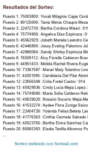 Lista de participantes: 40344560 Abad Rojas Palacios 007, 43513997 Adelayda Pardave Lazaro 018, 48129146 Adelina Blanco Estela 018, 76509112 Aivy Fiorella Calderon Bravo 018, 75991493 Alcida Victoria Amancio Montalvo 013, 22420224 Alejandra Teresa Toledo Minaya 006, 22527562 Alejandra Trujillo Santos 014, 40618293 Alicia Solano Corcino 009, 46422571 Amelia Remigio Chavez 001, 21258665 Ana Eulalia Hidalgo Arias 001, 41638774 Ana Monica Pardave Vergara 018, 22674149 Anabel Romero Gomez 002, 73600675 Angela Lucero Martel Arratea 008, 41741978 Angela Miriam Salazar Condezo 017, 46853063 Angelica Cabrera Albornoz 006, 75774906 Angelica Diaz Espinoza 018, 22477254 Angelica Maria Tolentino Leon 018, 22507493 Angelica Ruth Marin Borunda 012, 70800914 Anmd Jagger Kesvy Hurtado Pimentel 018, 72714681 Ayda Felipa Trujillo Carbajal 002, 41532274 Aydee Flora Zuniga Saico 016, 47394604 Azucena Margarita Estraver Valverde 007, 22472730 Bertha Cordova Misari 019, 40523765 Bertha Elvira Sanchez Calero 012, 22517039 Bertha Rafaelo Aguirre 011, 71244754 Betsy Catherine Tineo Durand 009, 71199595 Betsy Olenka Acero Dominguez 012, 47810103 Beverlyng Julissa Sanchez Quijano 008, 22474675 Brigida Piedad Leon Rodriguez 006, 73307319 Brillyth Yanely Parra Espinoza 012, 44201995 Candelaria Del Pilar Alomia Vitor 007, 22750777 Candelaria Lorenza Basillo Cespedes 006, 40948762 Carla Yanina Lucano Rojas 018, 22415970 Carmen Diaz Ingunza 006, 22400336 Carmen Ortiz Salas 016, 22518924 Carmen Rosa Miranda Gonzalez 019, 40247784 Catty Nancy Huanca Isidro 001, 00093388 Cecilia Almira Montecillo Santibanez 010, 47051991 Cecilia Katherin Chavez Quijano 010, 74158853 Cidy Yuleth Custodio Trancito 009, 45929936 Cindy Lucia Mejia Lopez 011, 46785203 Cindy Mardeliz Pre Guzman 012, 41776363 Cinthia Carmela Salcedo Davila 004, 44962691 Cintia Katerin Carhuaz Millan 006, 22656348 Cirila Fretel Castro 014, 71537890 Claudia Cristina Alva Berrospi 011, 22520401 Clelia Gomez Bacilio 009, 22465397 Clorinda Lusbelia Bravo Figueroa 018, 22403350 Concepcion Valentina Cabanillas Malpartida 018, 22883235 Dalila Ines Salinas Palomino 009, 47036741 Damaris Betzabe Trujillo Inocencio 008, 76201745 Deissy Milagros Arrieta Rodriguez 011, 22511188 Delia Cristina Munguia Agui 006, 72107713 Denisse Esthefany Aponte Rojas 011, 72383312 Devora Sarai Flores Castaneda 002, 70687017 Deysi Jacqueline Berrospi Tapia 004, 44782984 Diana Blas Seferino 010, 22505330 Dina Ursula Fuentes Gomez 017, 46892649 Dyancaro Palpan Valer 002, 73286927 Ebelyn Jemina Fuentes Ardiles 010, 40885150 Edhit Marleny Garcia Jaimes 017, 72375951 Edith Yasdaly Bartolome Tarazona 008, 80065383 Eladia Teofila Albornoz Pozo 012, 41152219 Elizabeth Antonia Marchan Valverde 008, 72037859 Elizabeth Milagros Perez Espinoza 016, 42741257 Elizabeth Roxana Huaqui Alvarado 012, 43056952 Elsa Milagros Fabian Calero 018, 22511221 Elvira Madeleine Ampudia Bonar 011, 76553274 Emily Estefanny Espinoza Chacon 014, 22486572 Ester Reveca Alva Alvarado 011, 43103698 Esther Aranda Mendoza 002, 77495559 Esther Rosalinda Amado Chavez 007, 47064096 Estrella Rossy Juan De Dios Dominguez 018, 22722977 Eufracia Martin Ferrer 006, 72772466 Evelyn Melani Eulogio Martin 005, 40650715 Filomena Sadith Santillan Gonzales 019, 47224711 Flor Clemente Gonsalez 011, 72377849 Flor Yasminda Masgo Laurencio 009, 45271573 Flora Pilar Barredo Simon 017, 22461307 Florinda Gonzales Venturo 012, 22509959 Fortunato Echeverria Santillan 008, 70861507 Franliz Lilian Vargas Durand 014, 75540193 Gerlly Naomi Dolores Tineo 012, 45026925 Gladis Edith Simon Tolentino 009, 22474224 Gladis Otilia Solorzano Armas 007, 47464413 Greta Maritza Bravo Quinones 018, 22666485 Guillermina Filomena Francisco Centeno 017, 60491035 Guisela Luz Maiz Palacios 009, 71935356 Guisella Caballero Ceferino 007, 44003439 Heidy Jackeline Barbaran Espinoza 018, 72042354 Hilary Pierina Falcon Tarazona 002, 22419627 Hilda Concepcion De Hidalgo 017, 46264233 Ibeth Teresa Lozano Leon 006, 60490951 Ines Deysi Ramirez Simon 009, 47657788 Ines Flores Picon 011, 71660046 Ingrid Selene Acuna Crespo 017, 60099809 Irma Vanesa Rivera Tolentino 009, 22407371 Ivonne Maritza Ramirez Claud 008, 22503260 Jacqueline Isabel Vasquez Escobal 001, 46971829 Jair Chavez Villanueva 008, 40585806 Janeth Liliana Cercedo Masgo 011, 41417451 Janneth Miriam Olivas Loarte 001, 74083346 Jazmin Kimberly Romero Cori 014, 75445600 Jennifer Margarita Zevallos Ardilles 001, 40973532 Jessica Del Pilar Cubas Delgado 014, 44756136 Jhon Raul Hinostroza Cabello 013, 46039305 Jhonattan Jose Marquez Ruiz 011, 72720186 Jimena Thalia Santillan Ramos 018, 45562929 Jobeth Mariela Leandro Cecilio 017, 42446890 Jossy Eveling Palomino Julian De Justo 018, 04221261 Judith Valle Canchari 005, 73068640 Juliet Emily Celis Santiago 016, 42919137 Karina Chavez Soto 014, 46052927 Karina Yudith Santos Apac 007, 47494257 Katherin Yelitza Romero Malpartida 012, 45673848 Kebbony Kelly Bozo Bardales 008, 42645224 Kely Espinoza Cruz 017, 48762224 Keren Mishell Tello Uriarte 005, 72424778 Kriss Alessandra Matos Aseijas 017, 41623506 Leisi Lopez Lima 011, 23013852 Lelis Flores Amasifuen 011, 45258745 Lencye Kruskaya Echevarria Argandona 006, 73774840 Leslie Yeneree Ramirez Aguirre 009, 47300830 Leydi Katia Leiva Caldas 008, 76865743 Leydi Sunmy Trujillo Santiago 018, 42663999 Lilia Yovana Gabriel Suarez 012, 47099757 Liliana Ventura Palomino 009, 42607945 Lindaura Emilar Rivadeneyra Sanchez 003, 44929775 Lisbet Paulina Rivera Vicente 002, 42702556 Liz Jenny Santiago Alcedo 017, 22489551 Liz Justiniano Concepcion 017, 22516441 Liz Nelly Flores Benavides 017, 48514753 Liz Tarcila Nolberto Moya 018, 40707173 Liz Yovana Moya Machado 001, 47834617 Lizbeth Martinez Espiritu 001, 72389531 Lizet Yaritza Nieves Gamarra 009, 22430560 Lourdes Eva Avila Tello 018, 41562547 Lucy Yabar Lastra 012, 76135525 Luisa Winetka Mendoza Sanchez 018, 43974088 Lupe Melissa Fretel Cahuas 018, 41019670 Lupe Milagros Fretel Cahuas 018, 41545059 Lu
