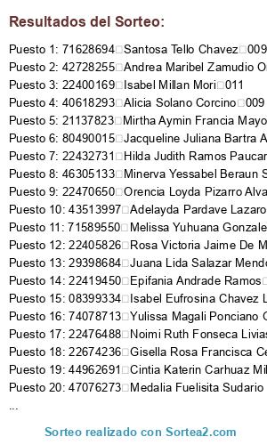 - Puesto 1: 71628694 Santosa Tello Chavez 009