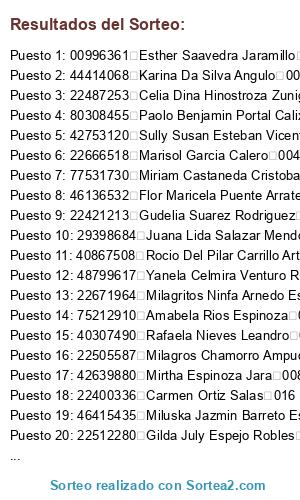 Lista de participantes: 40344560 Abad Rojas Palacios 009, 47288677 Abdy Vargas Muena 005, 22486435 Abigail Blanco Martinez 006, 43513997 Adelayda Pardave Lazaro 017, 48129146 Adelina Blanco Estela 018, 22493981 Adelina Leon Perez 008, 73589289 Adrian Alvarez Gonzales 008, 22515479 Agustina Gaspar Valerio 006, 22704616 Aida Isabel Gamarra Hilario 012, 74361666 Aide Elvia Raymundo Hilario 013, 22420224 Alejandra Teresa Toledo Minaya 006, 22527562 Alejandra Trujillo Santos 014, 77080197 Alexandra Yesenia Igarza Tisoc 013, 41601609 Alfredo Valois Dominguez Rosales 009, 40618293 Alicia Solano Corcino 009, 75212910 Amabela Rios Espinoza 003, 22643094 Amelia Bravo Cespedes De Orbezo 004, 44736618 Ana Cecilia Trinidad Nazairo 008, 21258665 Ana Eulalia Hidalgo Arias 001, 42598690 Ana Luz Vega Avila 014, 44115362 Ana Mely Tenazoa Rodriguez 001, 41638774 Ana Monica Pardave Vergara 018, 22674149 Anabel Romero Gomez 002, 22500257 Andrea Candelario Ramirez 009, 72002572 Andrea Sisi Arbe Suyo 014, 43566852 Angela Mily Salazar Figueroa 008, 41741978 Angela Miriam Salazar Condezo 017, 46853063 Angelica Cabrera Albornoz 006, 45608134 Angelica Edith Celestino Silvestre 019, 22477254 Angelica Maria Tolentino Leon 018, 48730684 Angi Dayana Zevallos Presentacion 014, 72431761 Angie Yassury Solano Rivera 012, 70800914 Anmd Jagger Kesvy Hurtado Pimentel 013, 73188464 Anny Melanie Beatriz Chavez Rivera 012, 40872309 Antonia Duni Velasquez Agama 008, 47284943 Anyela Espiritu Huaman 005, 20573174187 Arabella Beauty Center Srl 008, 73580013 Ariana Blanca Gutierrez Rodriguez 009, 22509665 Asalia Dominga Mendoza Pozo 008, 22414040 Aurelia Calderon De Ramirez 017, 42964510 Aurora Alicia Chaupis Chavez 003, 42150579 Avi Griselda Aponte Vega 011, 46661254 Beatriz Carolina Acero Pozo 001, 43222716 Beatriz Melany Guillermo Castillo 006, 22674386 Belia Maria Meza De Pozo 019, 48199313 Belinda Navarro Hoyos 017, 73582962 Belinda Skarlet Ramirez Juancho 005, 47798266 Benita Robles Ventura 017, 74123956 Benita Rosa Poma Vilca 016, 22960314 Berdith Avila Ramirez 008, 46188864 Bertha Maria Ayra Sandoval 012, 22414062 Bertha Ordonez Leon 014, 47980862 Betsi Cristina Rivera Estela 013, 42190684 Betsi Vivian Romero Ninalaya 016, 71199595 Betsy Olenka Acero Dominguez 012, 46536585 Betsy Paola Solorzano Malpartida 001, 71059766 Betty Ingrit Lazo Aliaga 005, 46939821 Betzabeth Marlene Chavez Bravo 001, 22517467 Blanca Deny Noblejas Cabrera 009, 72195157 Bonyt Yedi Rios Argandona 012, 46801336 Brenda Nataly Orbezo Bravo 004, 42757238 Briggith Evellyn Martinez Jara 014, 44268408 Brigida Elva Soto Yanac 003, 22474675 Brigida Piedad Leon Rodriguez 006, 44201995 Candelaria Del Pilar Alomia Vitor 009, 22750777 Candelaria Lorenza Basillo Cespedes 006, 22415970 Carmen Diaz Ingunza 006, 43519578 Carmen Elvira Cayco Figueroa 009, 22400336 Carmen Ortiz Salas 016, 10341152 Carmen Rosa Castillo Herrera 018, 22518924 Carmen Rosa Miranda Gonzalez 019, 22485916 Carmen Sadid Pizarro Alvarado 001, 76029196 Carolina Antuanette Beltran Laurencio 017, 73384799 Cassandra Marielena Hinostroza Ramirez 011, 00093388 Cecilia Almira Montecillo Santibanez 010, 47051991 Cecilia Katherin Chavez Quijano 005, 22499393 Celia Cruz Aguirre 014, 22487253 Celia Dina Hinostroza Zuniga 001, 22475866 Cherly Marlene Anastacio Gonzales 012, 42503202 Cinthya Dolly Zelaya Baldeon 014, 42080309 Cristobal Bravo Ramirez 003, 73944184 Dafney Creyssi Pasquel Santos 008, 76863428 Dalia Soila Tumbay Aranda 017, 47573183 Dalila Justo Aguirre 005, 41411694 Dalmiro Daniel Roque Palpa 014, 42948254 Deisy Diana Inga Aval 019, 40890992 Delcy Wilfreda Chahua Espinoza 016, 22511188 Delia Cristina Munguia Agui 006, 22963525 Delia Margarita Fabian Rojas 011, 72107713 Denisse Esthefany Aponte Rojas 011, 73589302 Deyanira Esmeralda Gonzalo Aquino 013, 71772395 Deysi Smith Estela Olortegui 006, 44782984 Diana Blas Seferino 013, 48547160 Diana Celeste Rivera Zambrano 014, 22507309 Diana Esther Soto Coz 019, 45800864 Diana Grisenia Cespedes Cespedes 006, 41086178 Diana Lizbeth Daza Perez 009, 77091026 Diana Lourdes Torres Condezo 002, 43484365 Dina Luz Davila Tuanama 001, 22505330 Dina Ursula Fuentes Gomez 017, 22479662 Diosa Linda Asencio Gonzales 005, 22521177 Dolila Campos Mallqui 014, 22490729 Donata Echevarria Cano 014, 22999863 Dora Clemente Ponce 013, 47871736 Dora Guivarra Cierto 003, 22440689 Dora Luz Rivera Trujillo 014, 47025708 Doris Prudencio Roman 013, 75836345 Doris Resurreccion Concha 005, 74889879 Doris Rosmery Carbajal Morales 002, 46892649 Dyancaro Palpan Valer 002, 72375951 Edith Yasdaly Bartolome Tarazona 008, 22481142 Edith Yeni Soria Malpartida 012, 04058224 Edith Yolanda Sudario Remigio 008, 40680837 Elcira Lozano Castro 002, 22890808 Elia Obregon Eulogio 008, 22418332 Elisa Del Pilar Taboada Bolarte 012, 22470447 Elizabeth Cabrera Castaneda 001, 22407259 Elizabeth Cano Villanueva 012, 22508247 Elizabeth Eusebio Segura 011, 22508111 Elizabeth Murrieta Salas 017, 44533424 Elizabeth Nelly Carbajal Morales 009, 40891003 Elizabeth Rivera Rosel 008, 22517709 Elizabeth Salazar Crespo 006, 47433974 Elizabeth Sandy Flores Diaz 012, 48016274 Elsa Mirado Hilario 016, 44342676 Eny Gaby Diaz Salgado 006, 22419450 Epifania Andrade Ramos 013, 42663971 Erika Doris Damian Zevallos 008, 22666532 Erika Escobar Rojas 004, 22513466 Erlinda Irribarren Jurado 008, 22512075 Esperanza Diaz Gallardo 014, 74657368 Estalita Alida Benancio Gregorio 003, 77037489 Estefany Daniela Bocanegra Maiz 016, 43103698 Esther Aranda Mendoza 002, 00996361 Esther Saavedra Jaramillo 013, 22722977 Eufracia Martin Ferrer 006, 40554403 Eva Maria Mandujano Papas 012, 42657387 Evalina Dalila Fernandez Huacho 012, 72772466 Evelyn Melani Eulogio Martin 005, 44198171 Faride Milagros Meza Ayala 017, 75401154 Fatima Rubi Leon Horna 013, 22498962 Felisa Cos Maiz De Soto 017, 22891612 Filomena Raymundo Quispe 014, 40650715 Filomena Sadith Santillan Gonzales 019, 73619354 Fiorella Marisa Berrospi Castillo 012, 71929427 Fiorella S